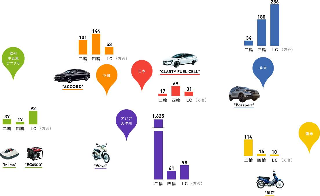 Honda創業の地である日本では、二輪・四輪・ライフクリエーションなどの各事業のほか、ロボット技術や新しいモビリティの可能性を切り拓く先進技術開発を行っています。未来の低炭素社会の実現に向け、電動二輪「EV-Cub」や新型燃料電池自動車「CLARITY FUEL CELL」、創・蓄エネルギーとエネルギーマネジメントを行う「Hondaスマートホームシステム」など、既成概念にとらわれない革新的な製品を次々と生み出しています。