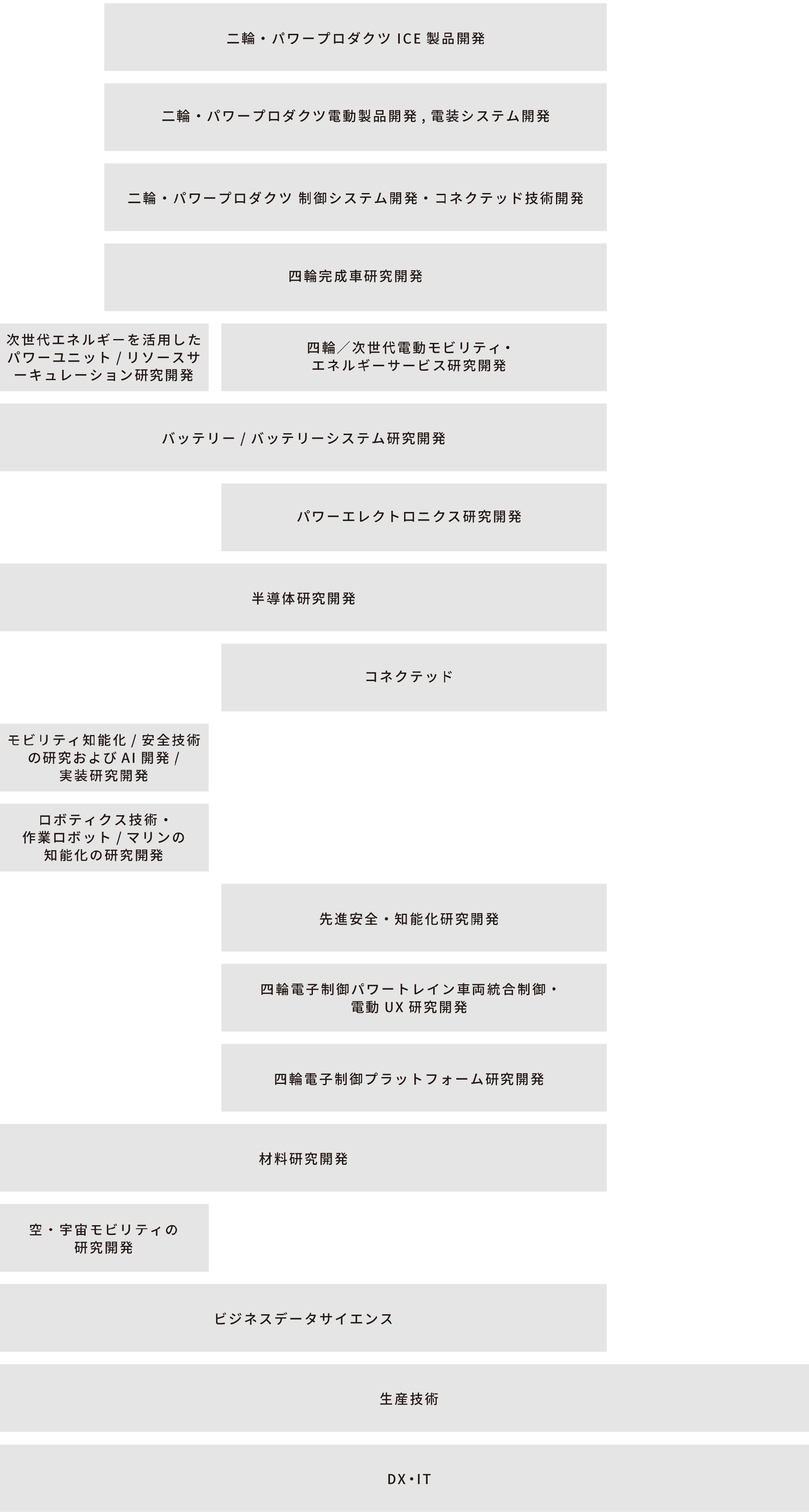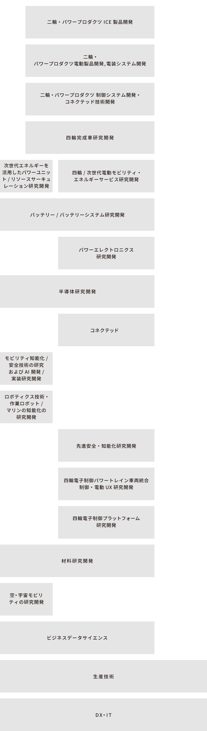 クラウドと連携したデジタルサービスやソフトウェアアップデートによる新たな価値提供と電動化・先進運転支援・安全運転支援といった二輪・パワープロダクツ・マリン製品において機能進化を具現化する電子制御プラットフォームとパワートレイン制御技術・車体/船体制御技術(レース車両含む)の設計・研究開発を行い、