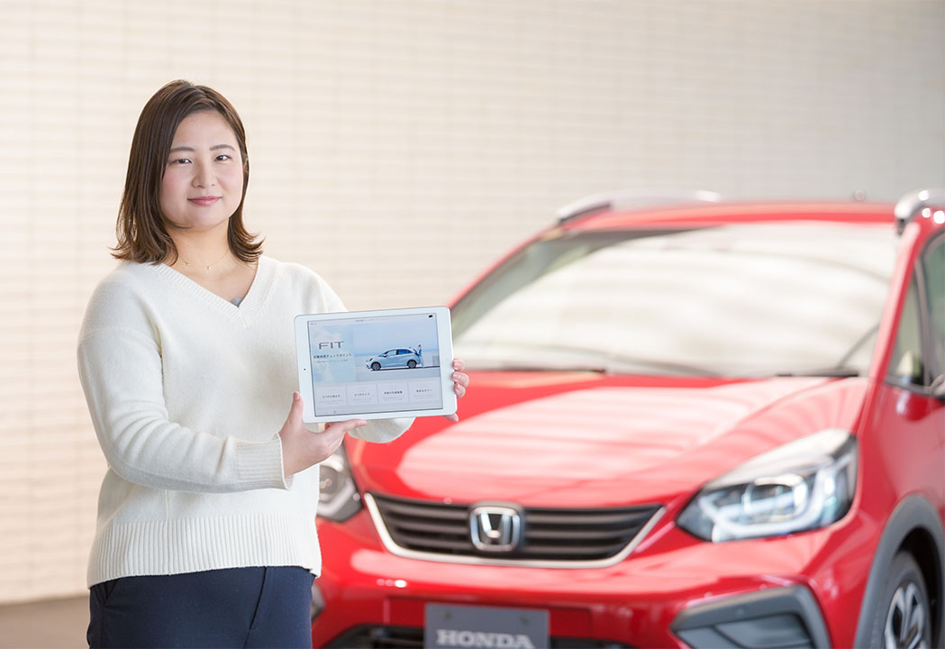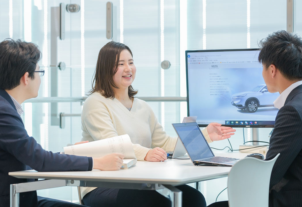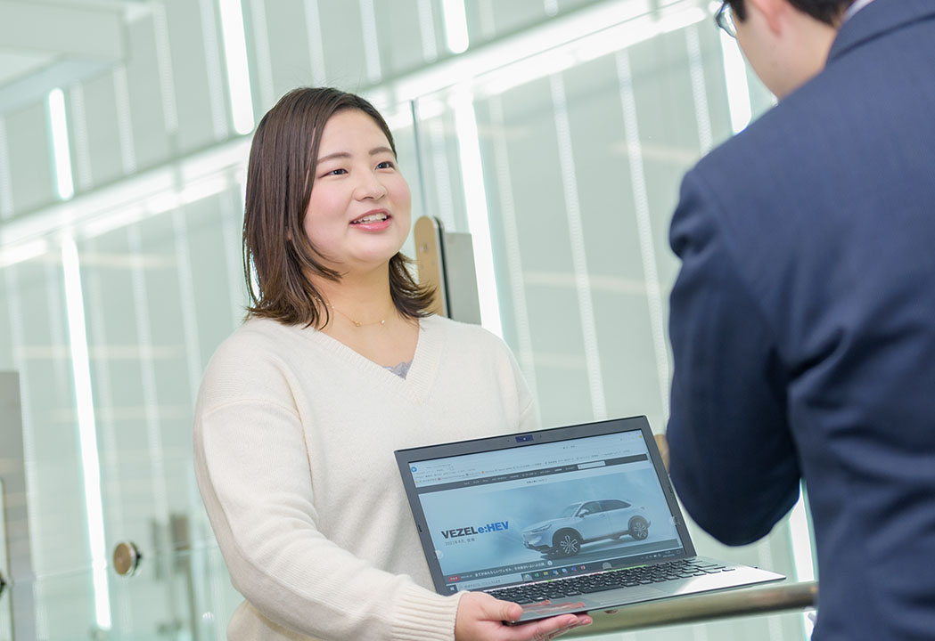 商品企画課は、営業領域として新商品のコンセプト発案から発売後のセールスプロモーション、販売戦略の方向性を定め、統括や指揮をする部門です。そのなかで私の担当業務は、お客様への販売を手掛ける「Honda Cars」向けの学習教材やイベントを企画すること。現場へのリサーチなども実施しながら、日本全国のスタッフに新製品の強みが伝わるように努力しています。