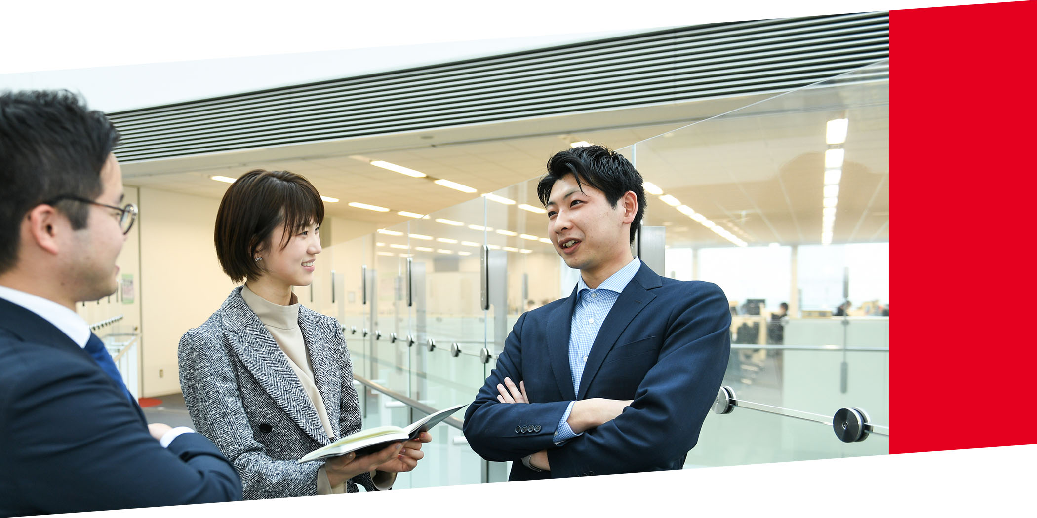 私を含む3年目と、2年目、1年目のメンバーを合わせて、若手が9人所属しているチームで、活気があります。それを課長、係長、チームリーダーが見守ってくれています。課長も私のチームリーダーも女性で、メンバーの男女比率のバランスもいいと思います。